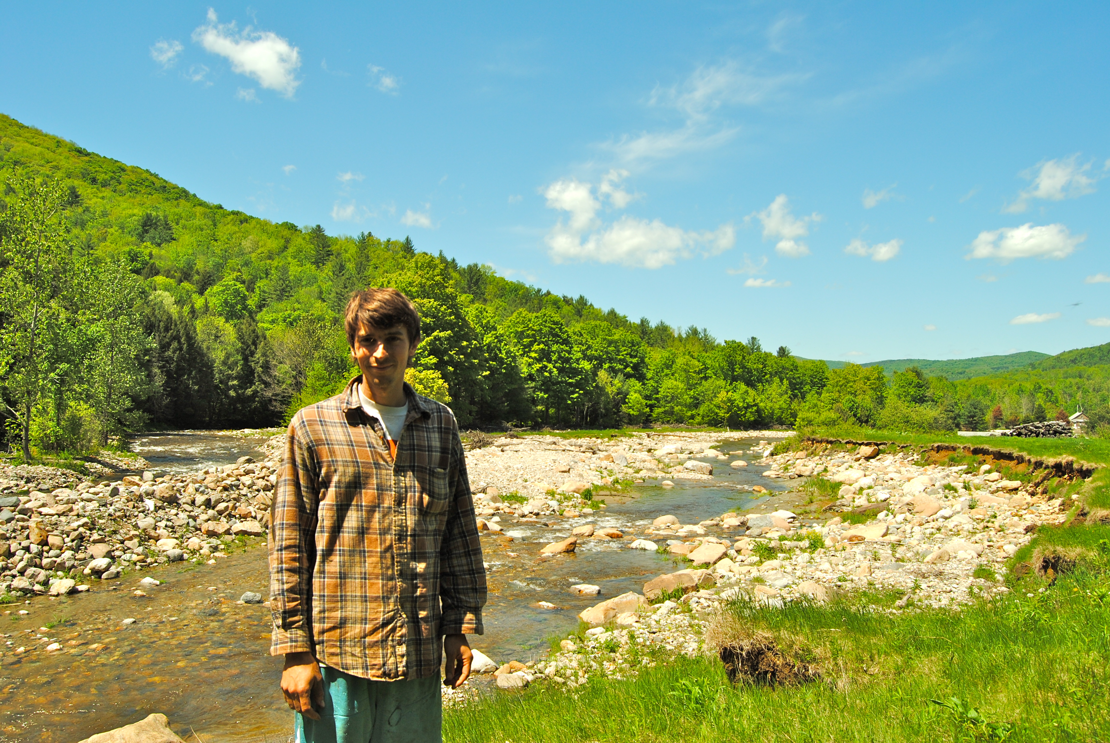 At last, we arrive at Evening Song 2.0, with its 5 acres of vegetables. However, in the time it takes us to find the new farm, Ryan Wood Beauchamp and Kara Fitzgerald have gone back downhill the old one to eat lunch and rest after a morning in the field. Their newly hired farmhand calls to tell them to expect us, and we head back down into the floodplain. Beauchamp comes out to greet us, and we walk along the river that flows where Evening Song’s crops used to grow.