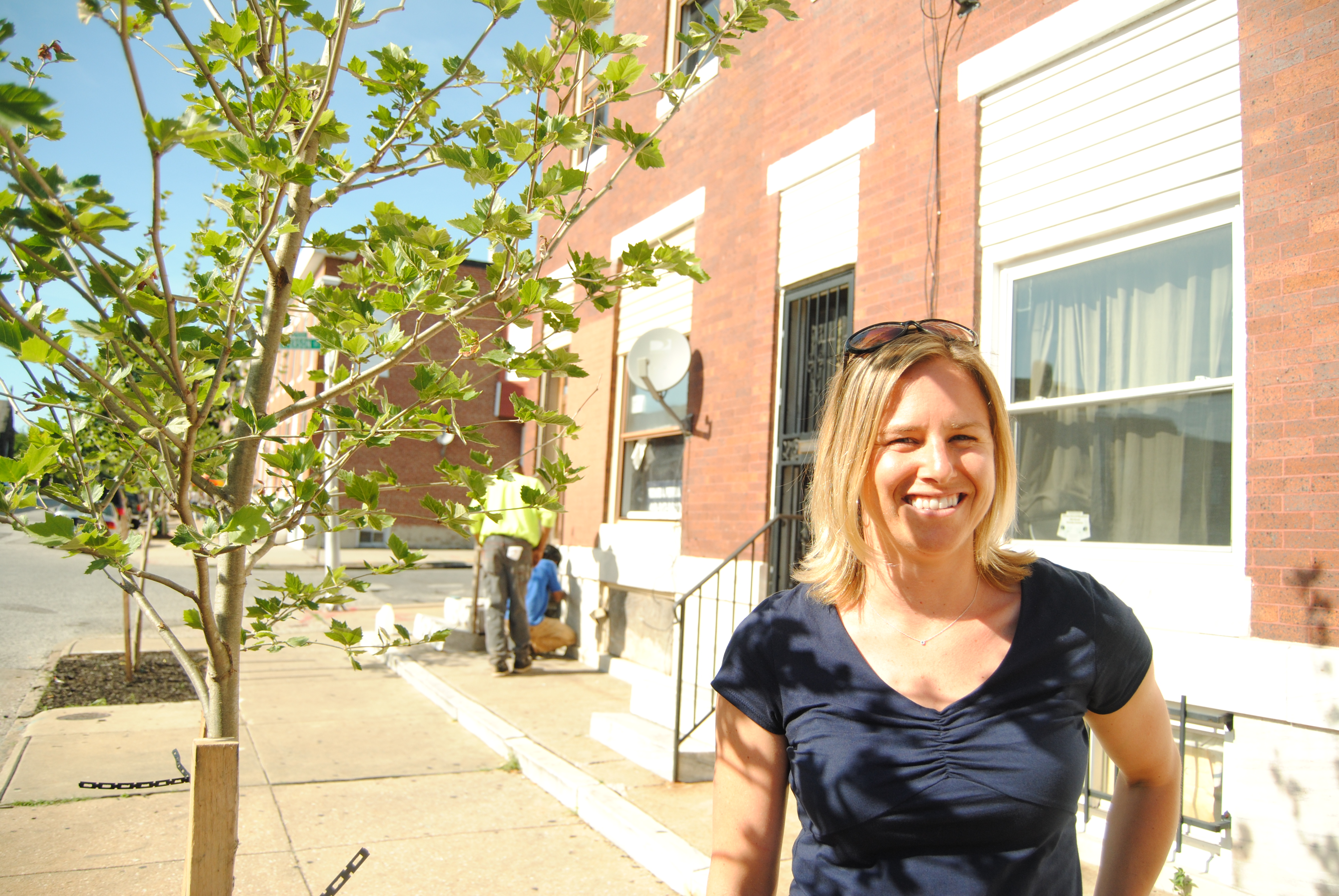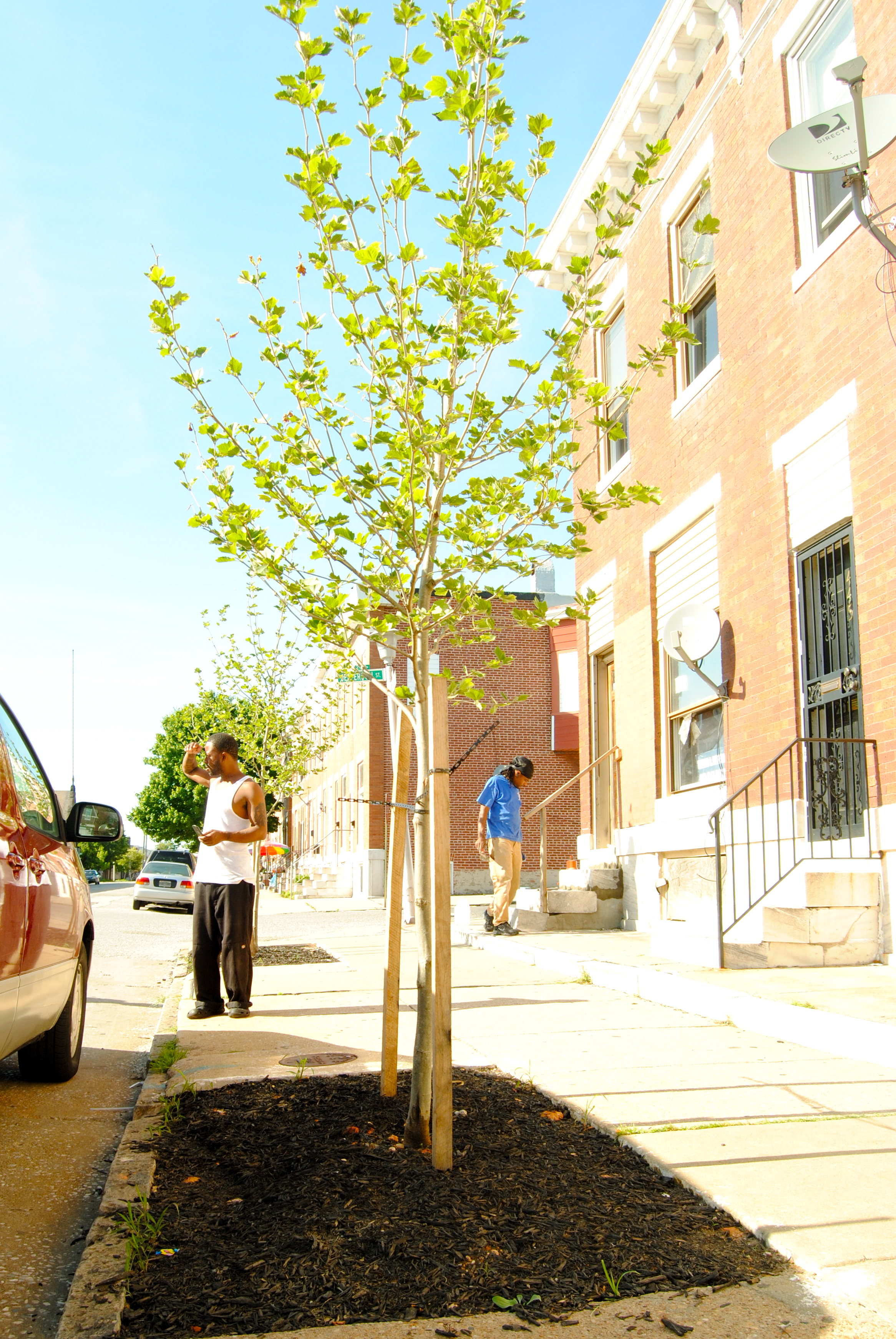 The urban heat island effect occurs when built-up areas absorb more heat than the surrounding rural areas. In 2008, an analysis by NASA showed that Baltimore’s land surface temperature can be as much as 50 degrees Fahrenheit hotter in the city center when compared to the surrounding temperate forest. Without accounting for the Heat Index, the City’s Climate Action Plan predicts that Baltimore will experience between 15 and 35 days over 100 degrees Fahrenheit by 2100, as compared to the average 5 days per year at the end of the 20th Century. These predictions are especially concerning for Baltimore’s vulnerable population of elderly, poor, and homeless residents.Tree canopies can lower direct temperatures up to 9 degrees Fahrenheit, but they also have many co-benefits. They absorb air pollutants and stormwater, plus they cool buildings, reducing energy bills. Canopy can also make neighborhoods safer. A 2012 study showed that a 10 percent increase in Baltimore’s tree canopy reduced the neighborhood crime rate by 12 percent. A young resident of North Luzerne Avenue told Baja that the trees recently planted on the block had changed the way people in her community were talking to each other, and that she actually felt safer.