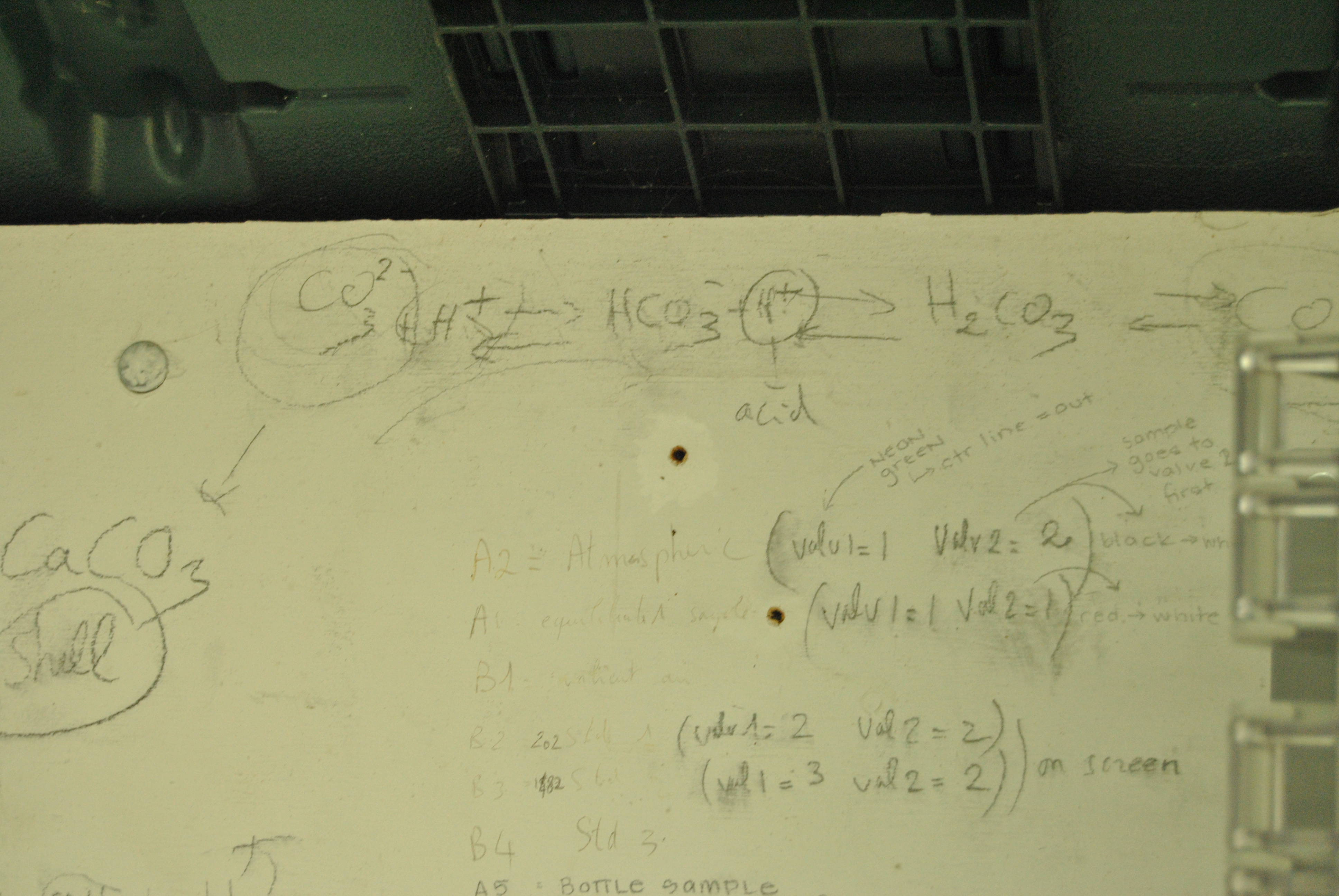 The carbonate cycle, which explains how the oceans are acidifying, is written on a white board next to monitoring equipment at Taylor Shellfish’s hatchery.