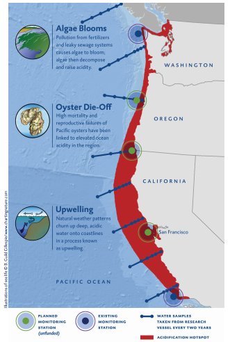 A scientific investigation by Oregon State University researchers determined that the larvae loss was definitively linked to ocean acidification. The pH of ocean water historically hovered around 8.16 (7 is a neutral pH), but over the last two centuries, the oceans have absorbed a third to half of the carbon dioxide emitted through the burning of fossil fuels. This has resulted in increasingly acidic water, and the average pH of the world’s