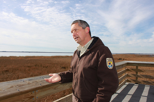 Standing on a planked observation deck overlooking a gorgeous slice of marsh, Matt Whitbeck, the Supervisory Wildlife Biologist for Blackwater, describes what would happen if people did nothing to stop marsh loss at the Refuge: “This here platform would become a fishing pier.”