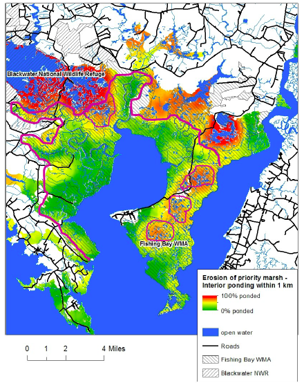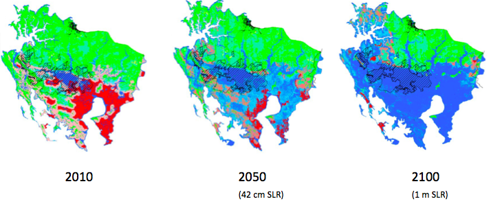SLAMM (Sea Level Affecting Marshes Model) simulations show dramatic marsh loss in Blackwater National Wildlife Refuge (the cross-hatched area) and its surroundings by the end of the century. Red areas indicate (diminishing) critical bird habitat if people do not intervene.