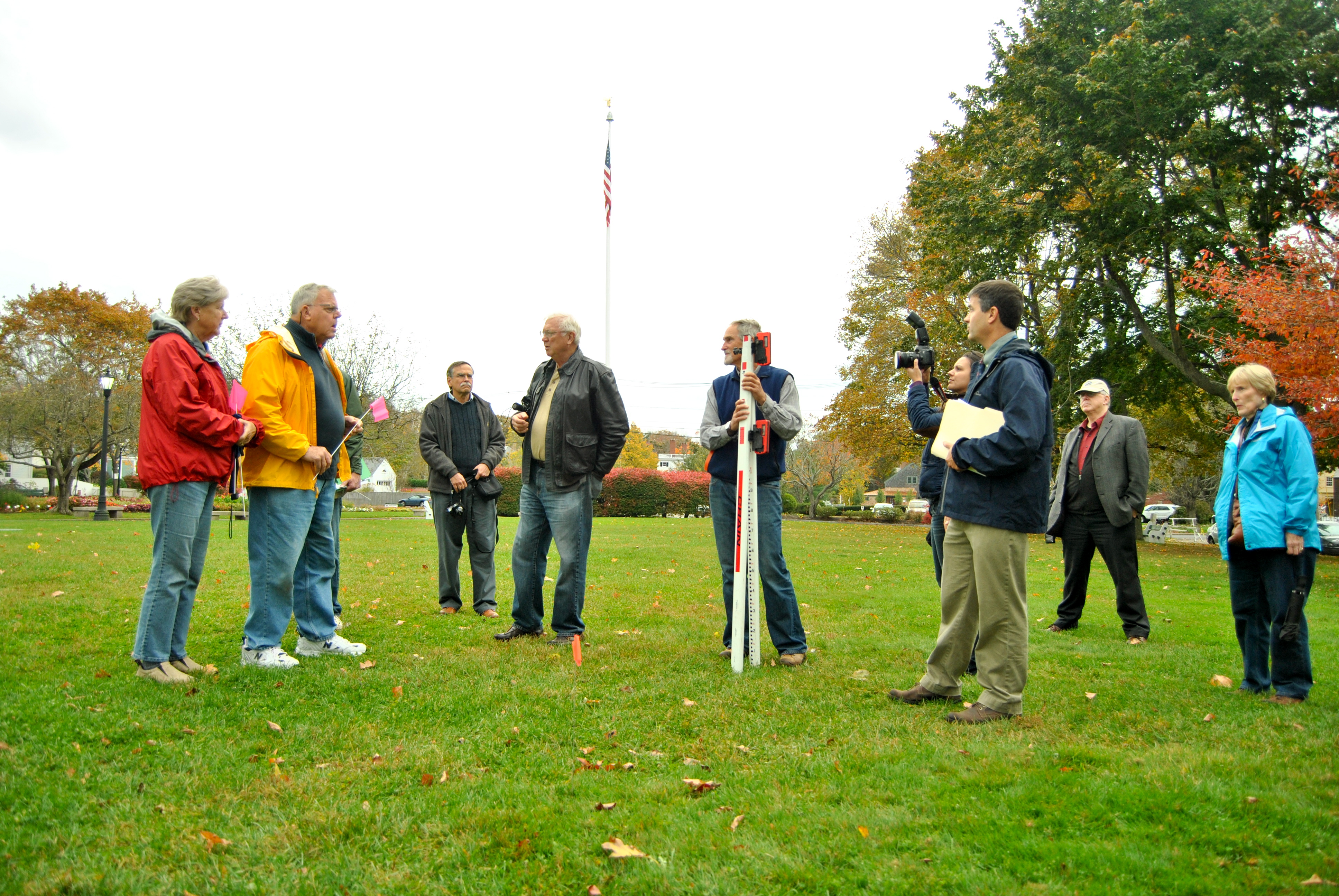Peter Britz and one team of walkers explore the floodline with their laser level. Prescott Park is an important place in the Portsmouth community.